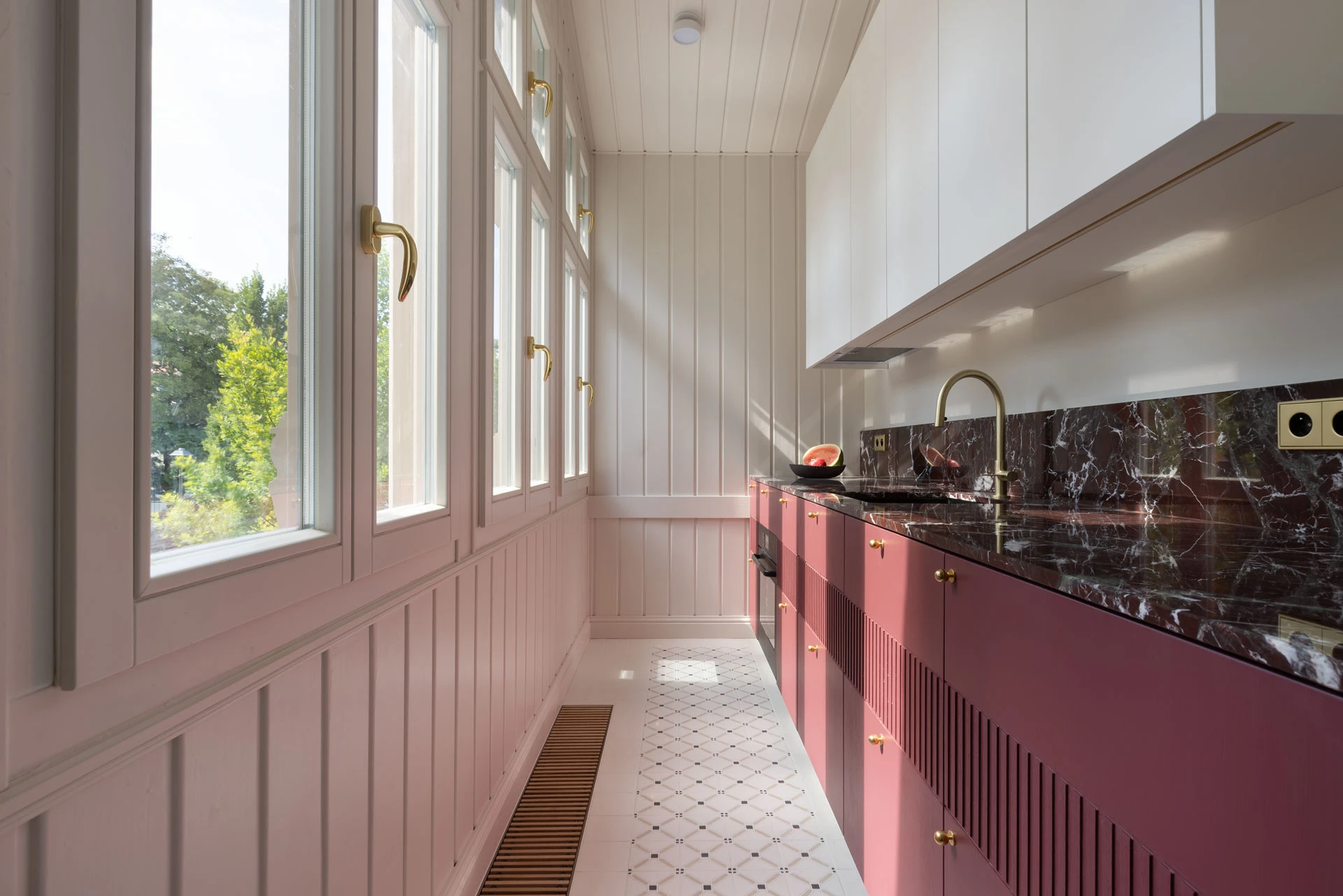 Fotografia skończonej kuchni zlokalizowanej w odrestaurowanej i docieplonej werandzie.