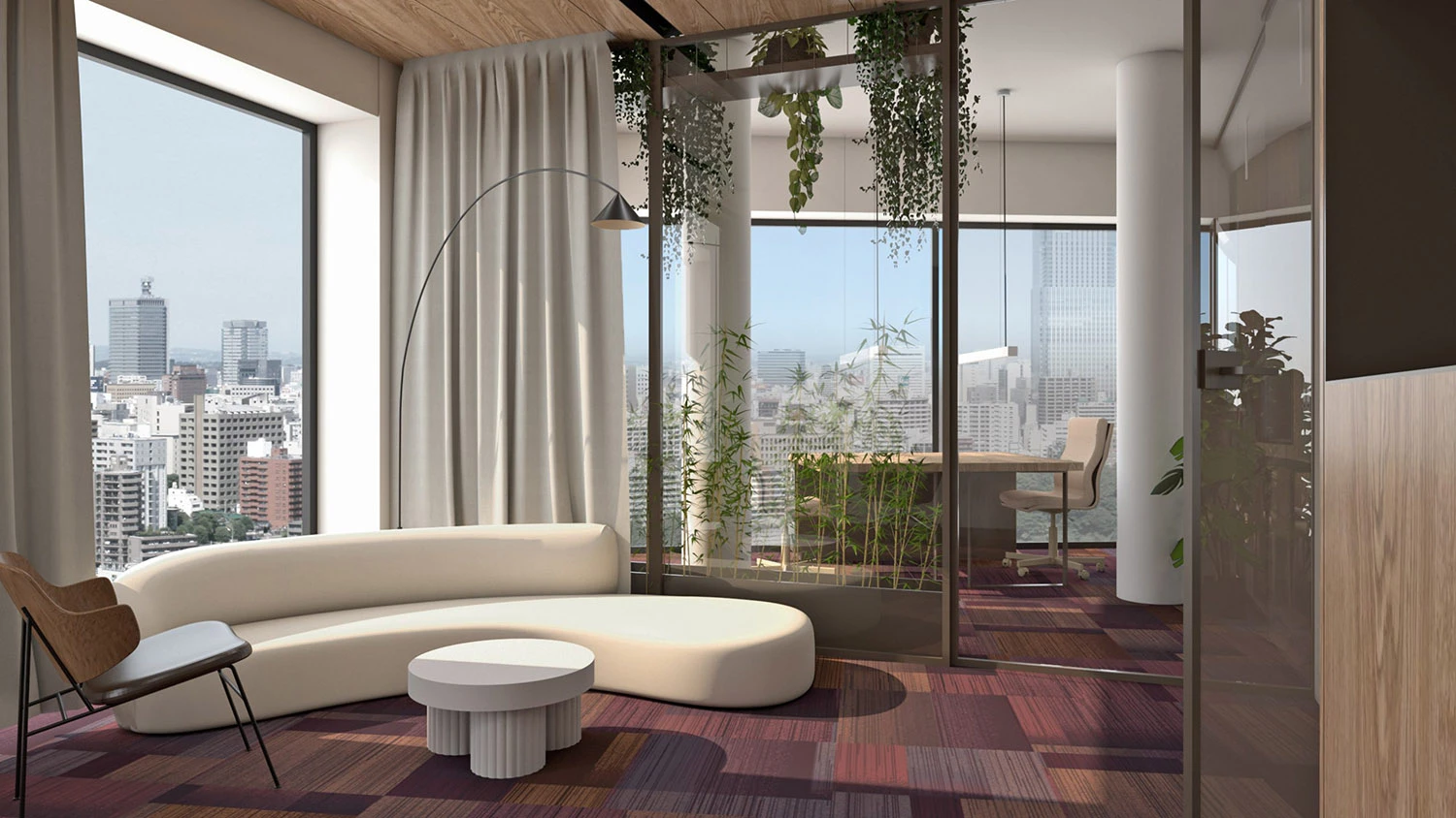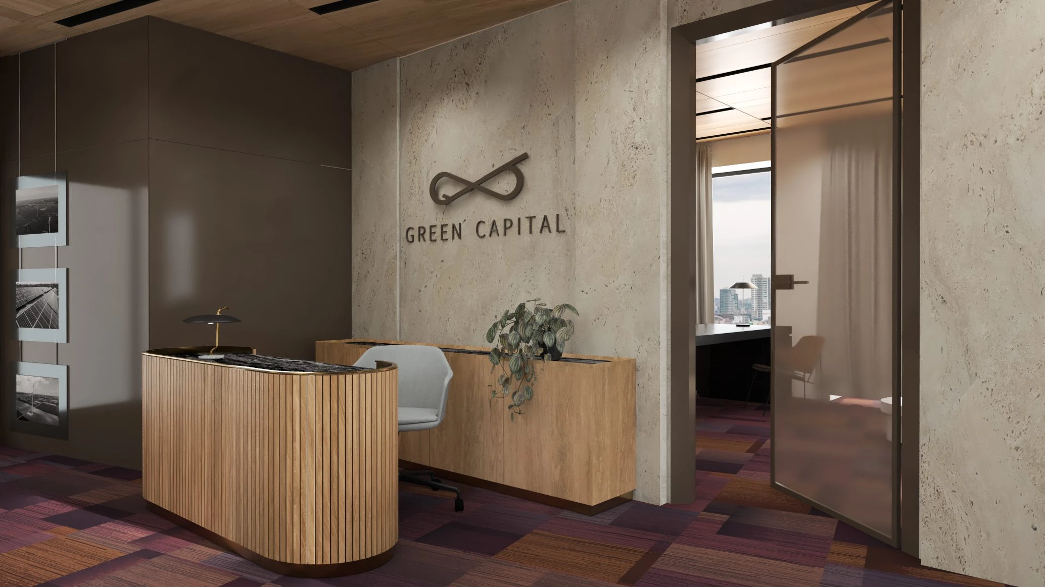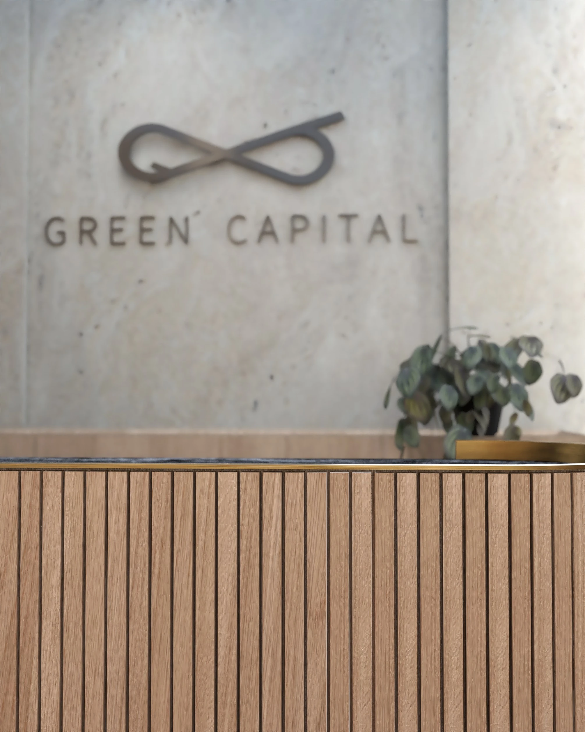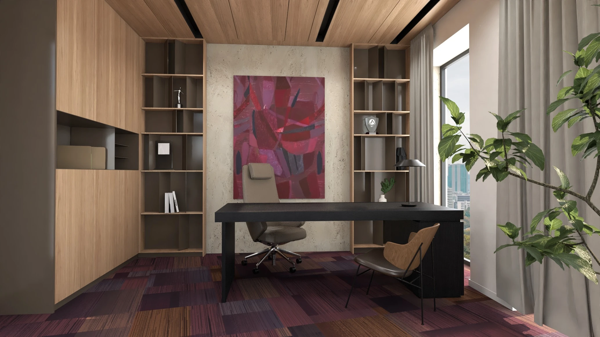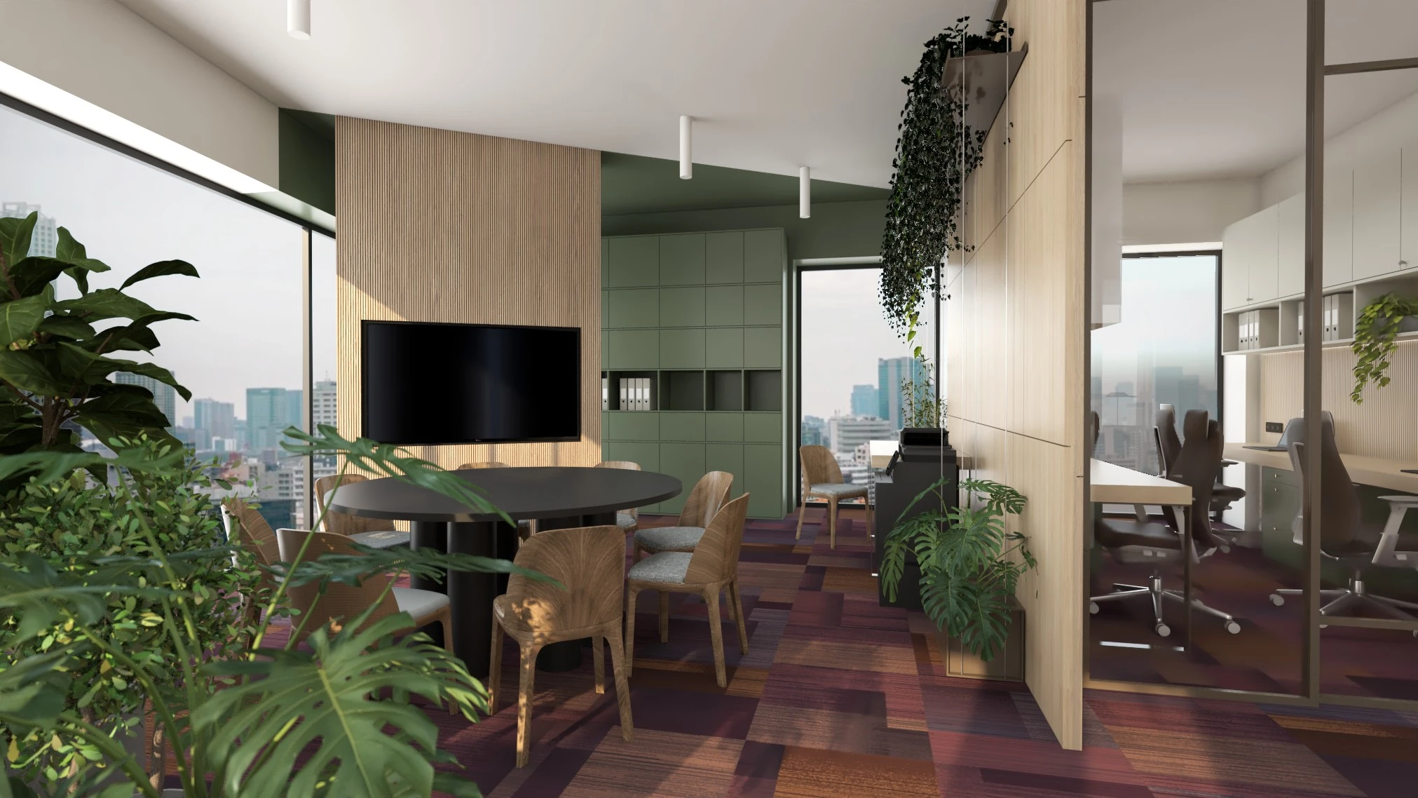 Drewno i trawertyn — naturalne, ponadczasowe — tworzą tu fundament, który wykracza poza estetykę. Ich trwałość i zdolność do starzenia się wnoszą do biura głębię — jakby z każdym dniem przestrzeń nabierała więcej charakteru, świadcząc o swojej długowieczności i odpowiedzialności za środowisko. To materiały, które nie krzyczą, lecz opowiadają — o czasie, stabilności, o elegancji, która nie potrzebuje potwierdzenia. Tę narrację uzupełnia zieleń — rośliny, które miękko osiadają na tle surowych powierzchni, oraz intensywny, wiśniowy akcent wykładziny, wprowadzający energię, nie zakłócając spokoju. Biuro, które służy, ale i zaprasza — do myślenia, do oddychania, do bycia.