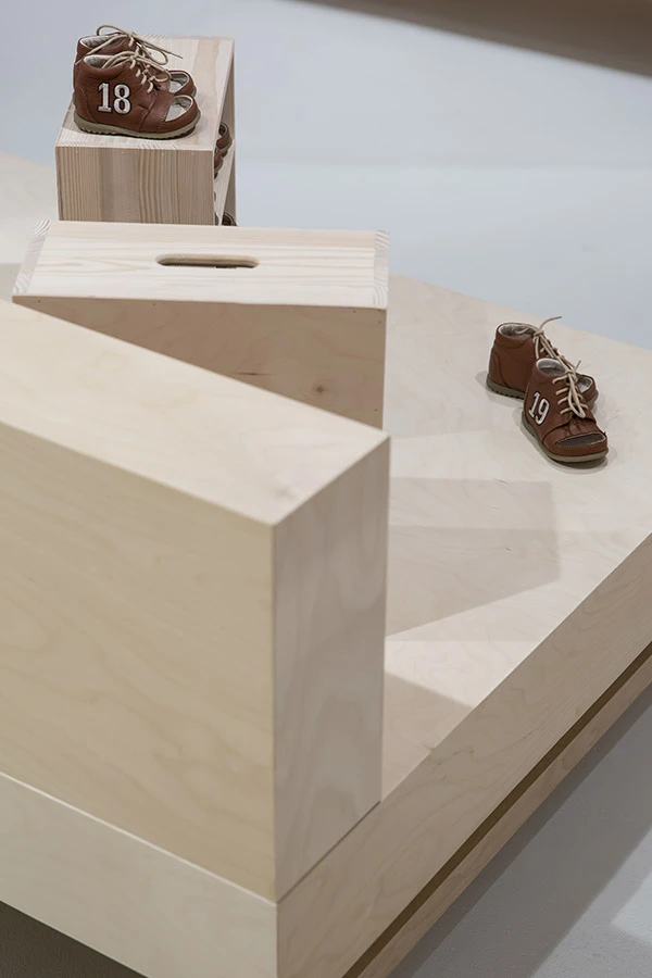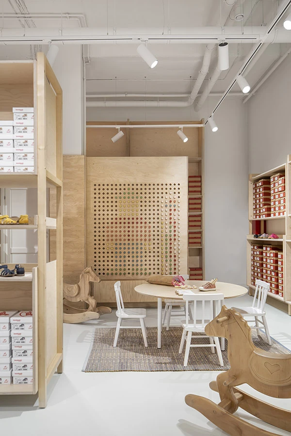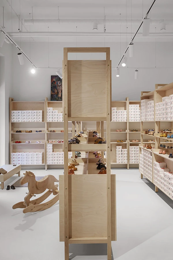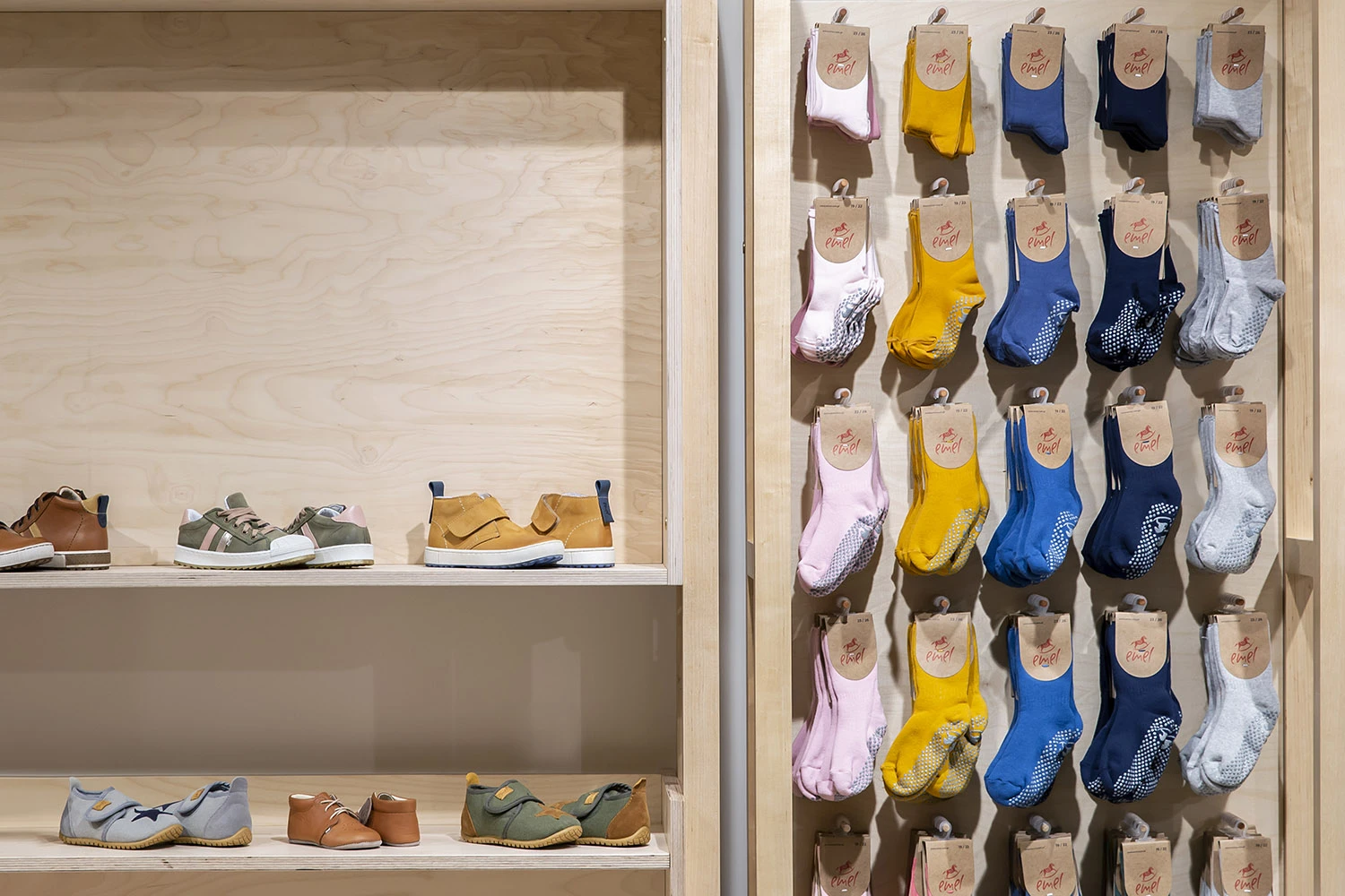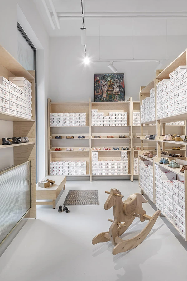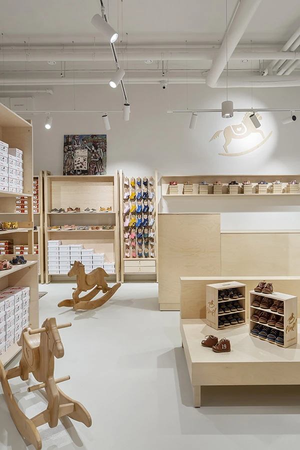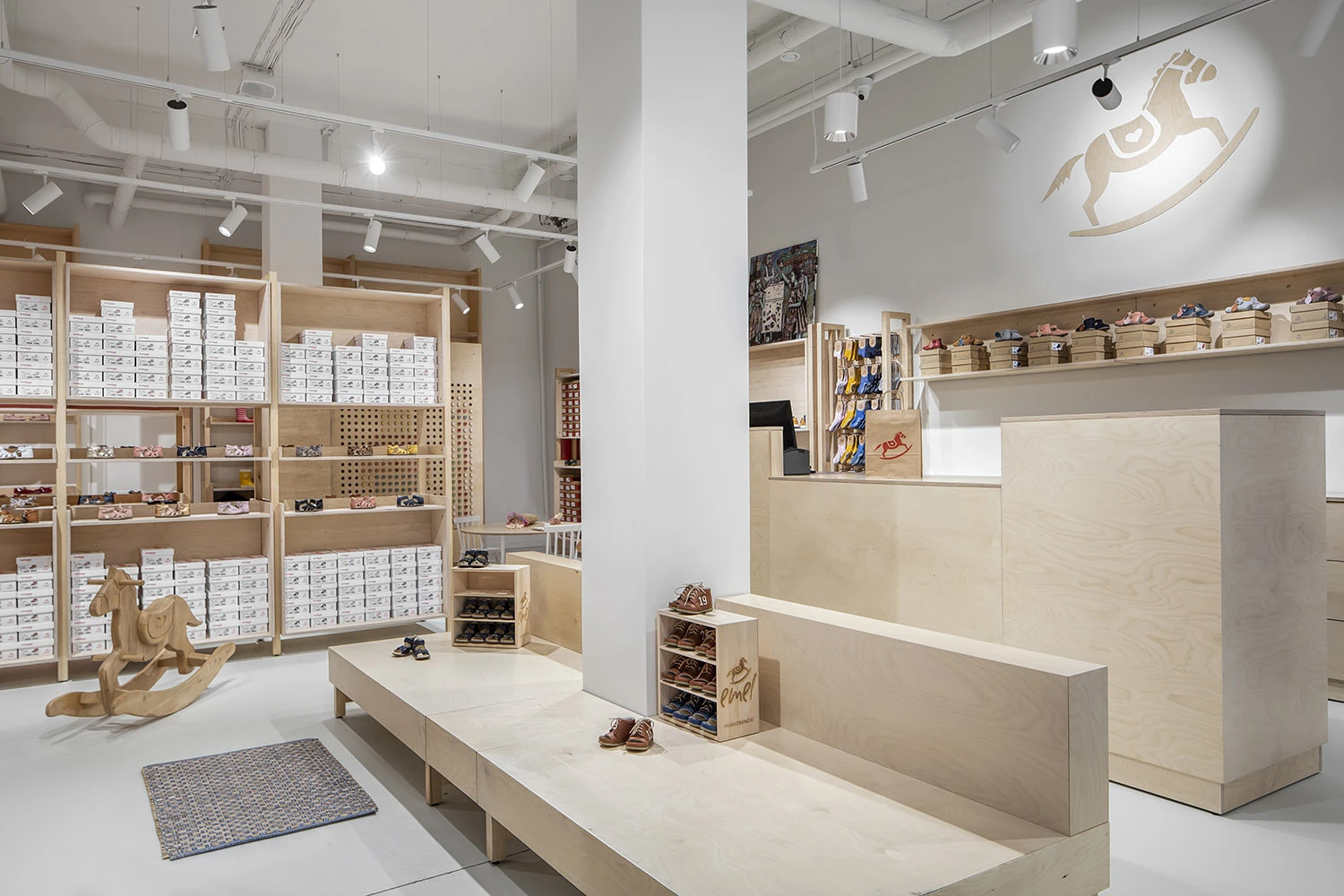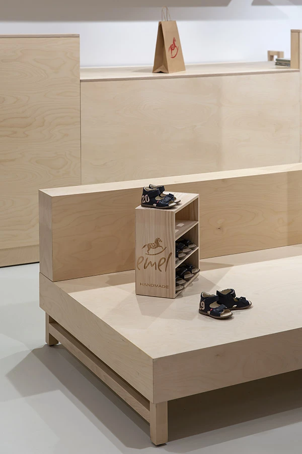 W tej kameralnej przestrzeni pierwsze skrzypce grają rzeczy małe — dziecięce buty, ręcznie szyte z miękkiej skóry, pełne czułości i uważności. Całe wnętrze podporządkowano im, jakby szeptem mówiło: „to one są najważniejsze”. Indywidualnie zaprojektowane meble ze sklejki brzozowej — lekkie, funkcjonalne, naturalne — pozwalają wyeksponować produkt bez zbędnych ozdobników. Ich forma jest prosta, ale przemyślana. Tło z bieli ścian i podłóg działa jak cichy towarzysz — nie narzuca się, ale podkreśla charakter miejsca. Ale to także przestrzeń przyjazna dzieciom — z małym zakątkiem, w którym mogą poczuć się swobodnie, dotknąć, pobawić, rozejrzeć się po swojemu. Bo tu, tak samo jak estetyka i funkcjonalność, liczy się komfort najmniejszych. Ten sklep to opowieść o tym, że piękno zaczyna się w szczególe — i że czasem wystarczy jasne drewno, światło i trochę miejsca dla wyobraźni, by je wydobyć.